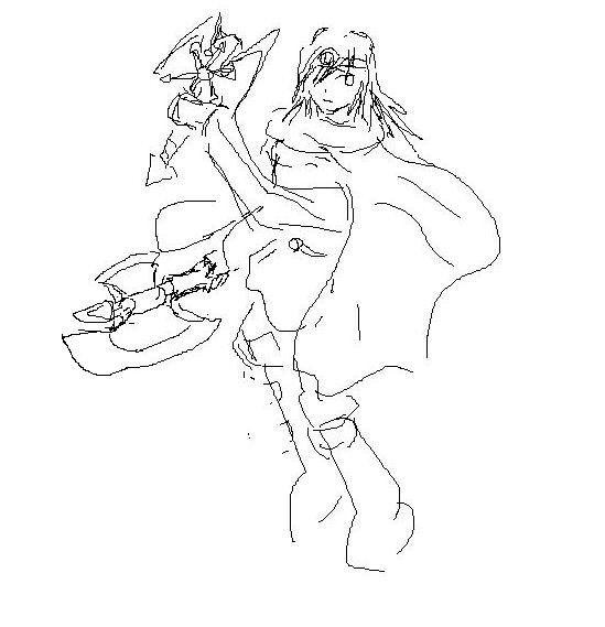 今回描かせて頂いたものが女の子に持たせる剣だった際に、ちらとでた話から大バサミやら斧は流石に似合わんだろうと言いつつ、レフィルには斧を持たせてたなぁ…とばかりに、斧装備のレフィルの構図です。